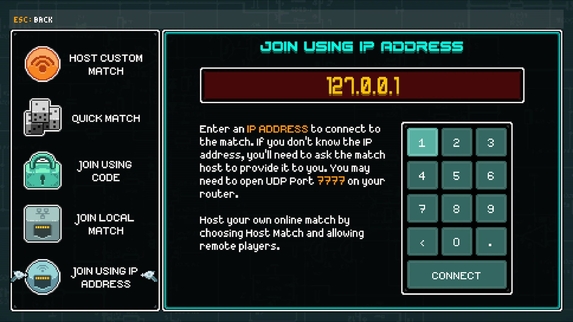 - Enter the hosts internet IP address (the host will need to have UDP 25000 forward through their router/firewall).