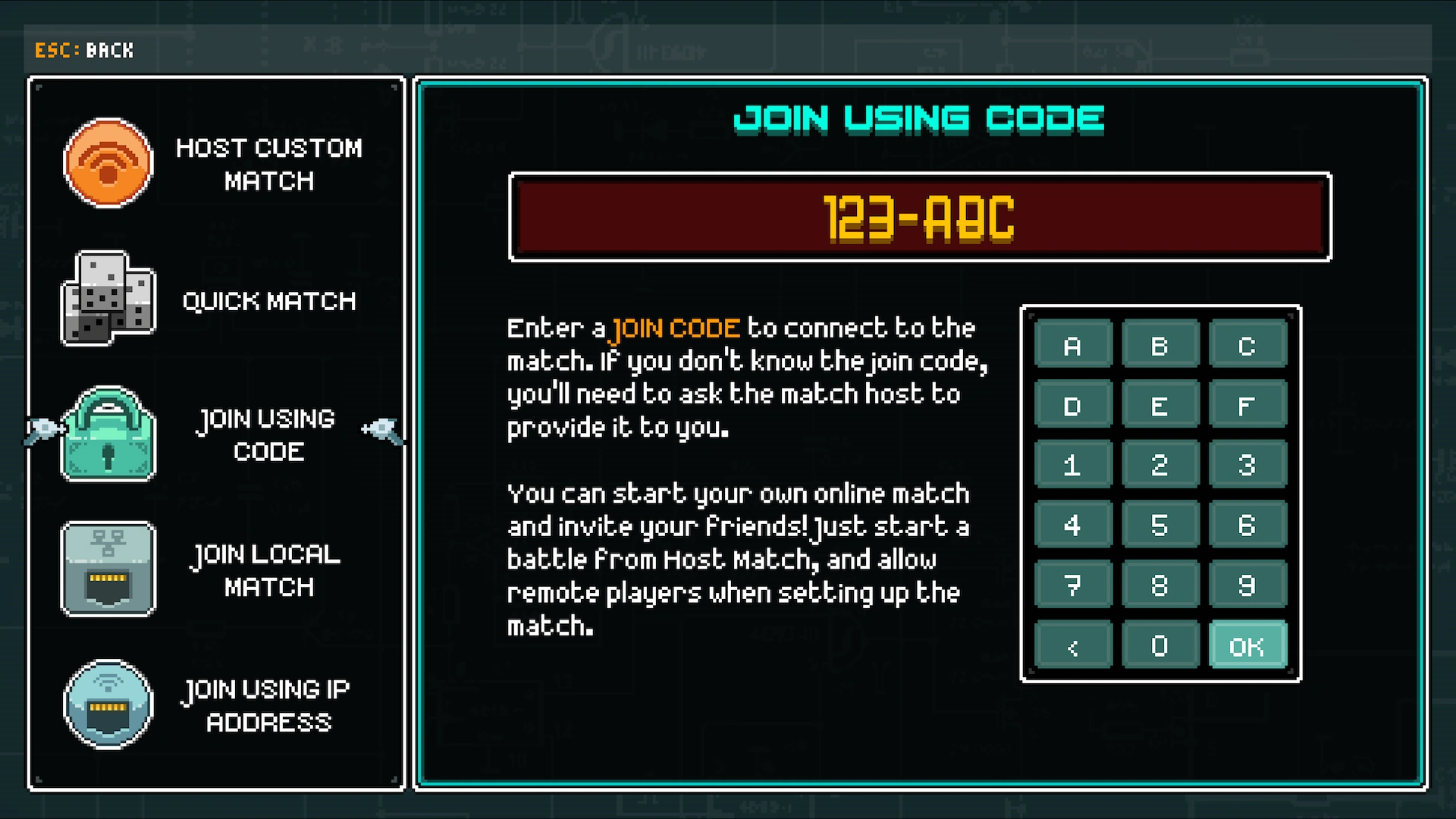 This section covers hosting and joining matches online.